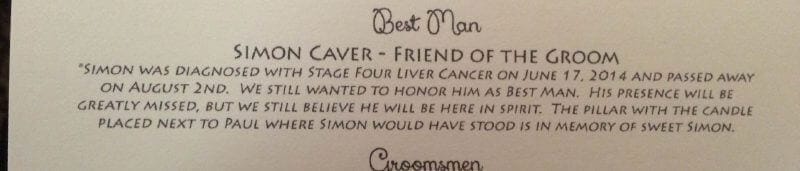 We were thinking about calling it a night when the DJ announced the bride had a surprise for the groom. Just days before Simon passed, the bride had contacted me about recording a best man speech. Simon was hardly awake at that point, but we were able to get about a minute of him professing his friendship and admiration for his best friend. He ends the speech saying he loves him. It was emotionally painful for me to record and physically taxing for Simon. I hadn’t thought much about it until the bride handed the groom her phone to watch and the DJ patched in the audio for the rest of the guests to listen in. I couldn’t hold it together at that point but frankly, neither could anyone else. And I was so glad for that one minute. On his darkest days and in his highest highs, the best friend will know and have proof that Simon loved him like a brother until death.